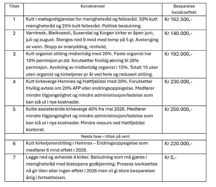 Hemnes og Hattfjelldal kirkelige fellesråd har vedtatt følgende tiltak for reduksjoner i driften som følge av budsjettforslagene fra Hemnes og Hattfjelldal kommuner:
